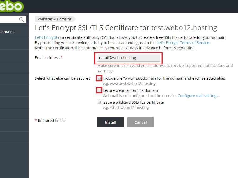 Enter a valid email address in the field and check the box “Include a “www” subdomain for the domain and each selected alias”, if you want the SSL Certificate to cover the domain both with and without the “www” prefix, and then click on the install button.