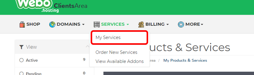 Login to clients.webo.hosting in the main menu under “Services” select “My Services”